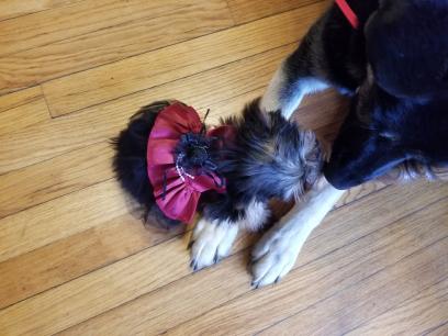 | german shepherd dog with yorkie yorkshire terrier puppy puppies dress fance |