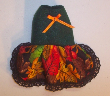 These little dresses are made in a variety of ways. This one is a cute little Fall Leaves Print skirt trimmed with Black lace and has a Forest Green polar fleece top complete with a little Orange bow.