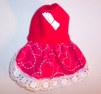 These little dresses are made in a variety of ways. This one is a Heart Print with a Red polar fleece top complete with a little zig zag white Bow and White lace trim.