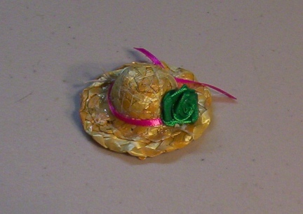 This is cute and even cuter with a rat head under it. It is a rat sized and has a little flower with a ribbon hat band, quite a Lady Rat Bonnet. It stays on the ratties head with elastic. The elastic is left long when it arrives to you so that you can cut it or tuck it to fit your own rattie.