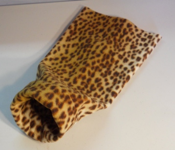 It is made with a Leopard/Cheetah Print Polar Fleece with a plastic ring to keep the front open. The front has about a 5" diameter and is approx. 17" long.