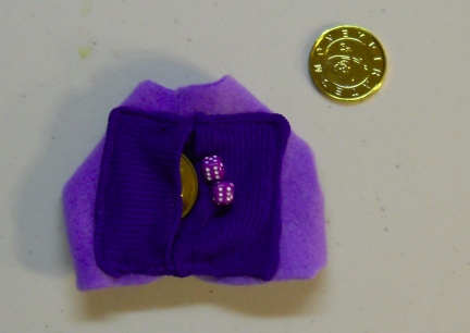This Set has two Rat Sized Purple Dice sewn unto the pack with a Plastic Gold Colored Pirate Coin in the opposite pannier/pocket.
