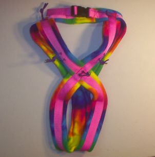 This multipurpose harness will fit most dog that weigh approx. 46 - 71 pounds. It is made with Pink poly webbing with Rainbow polar fleece padding. The black quick release buckle has extended polar fleece for padding.