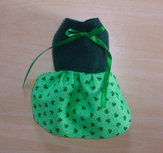This one is a Cute St. Pat's Dress made from Green Polar Fleece with a cute Shamrock Print skirt. It has A Green bow on the blouse.