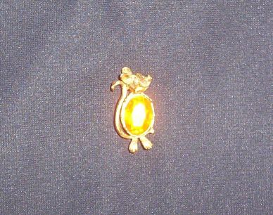 The pin/broach is approx. 1 1/2" x 3/4". It is gold toned and has a Yellow "Topaz" cut glass stone for a belly. It really is cute.