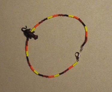 This is a cute little bracelet made of yellow/orange/brown/black seed beads with a black approx 1" charm. The bracelet is approx. 9 3/4" long. This bracelet has a "lobster claw" type closure.