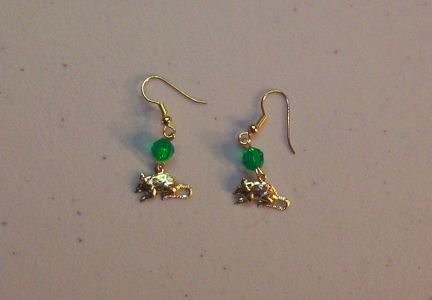 Cute Rattie earrings with green beads. The charms are approx 1/2" and are hung from gold toned fish hook type earring holder.